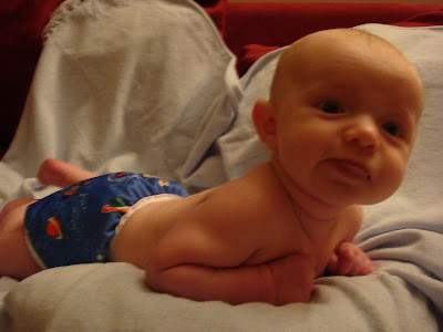 Thanks for bearing with me over the last couple of weeks as we have shaken things up a bit and started to (*gasp!*) use cloth diapers. Your Dad isn't so into it, but as you'll find out as you grow older, he's a good sport and he is indulging me by giving cloth diapering his best shot. So far you seem completely unfazed by the change. I don't know what it is about it, but I love the cloth. The only drawback to it that I see is that it makes your butt look big. This somehow does not bother you. You're lucky you're not a girl or you would be developing a complex right now.